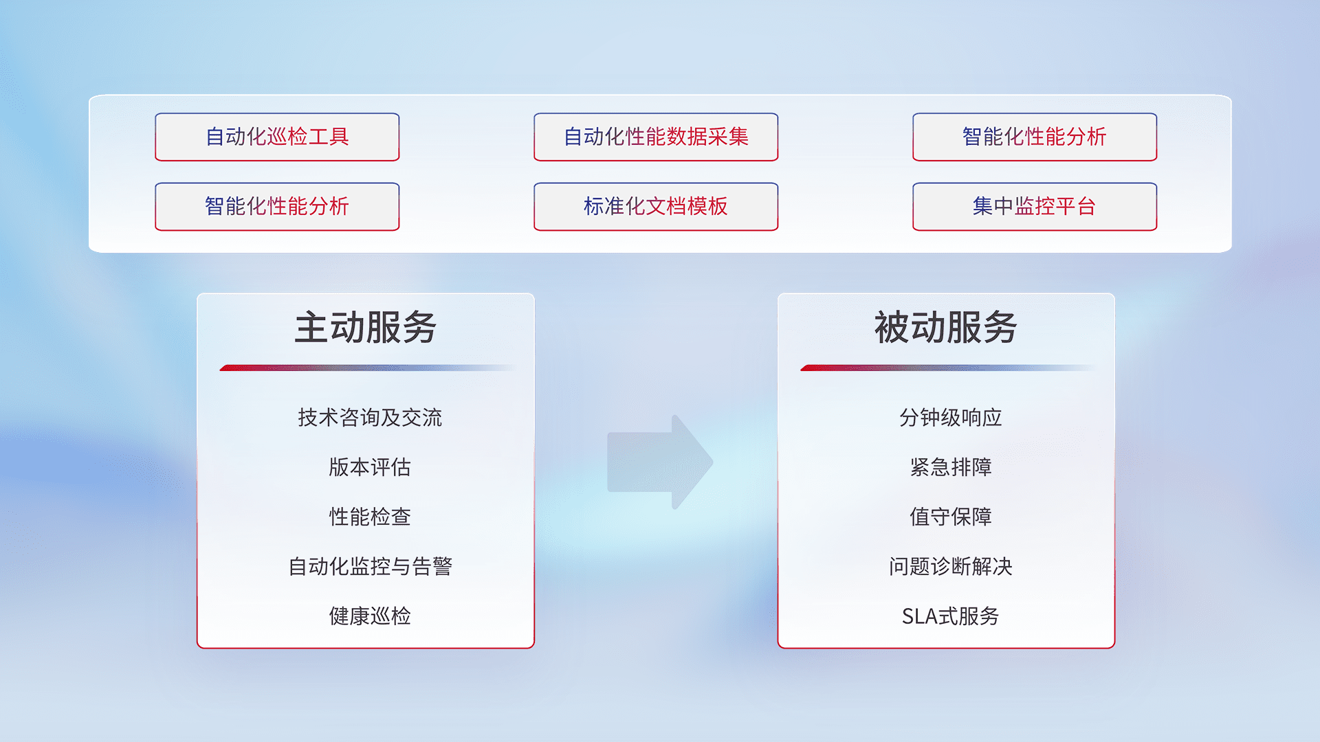 智能化工具和标准化文档,,,保障服务质量,,提供主动服务(包含技术咨询、、版本评估、、、、性能检查、、、、自动化监控与告警、、健康巡检)和被动服务包含(分钟级响应、、紧急排障、、值守保障、、问题诊断解决、、、SLA服务)。。。