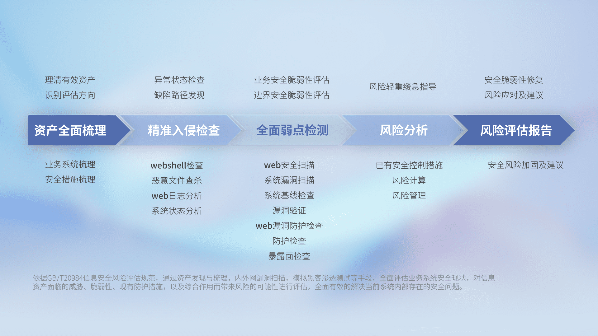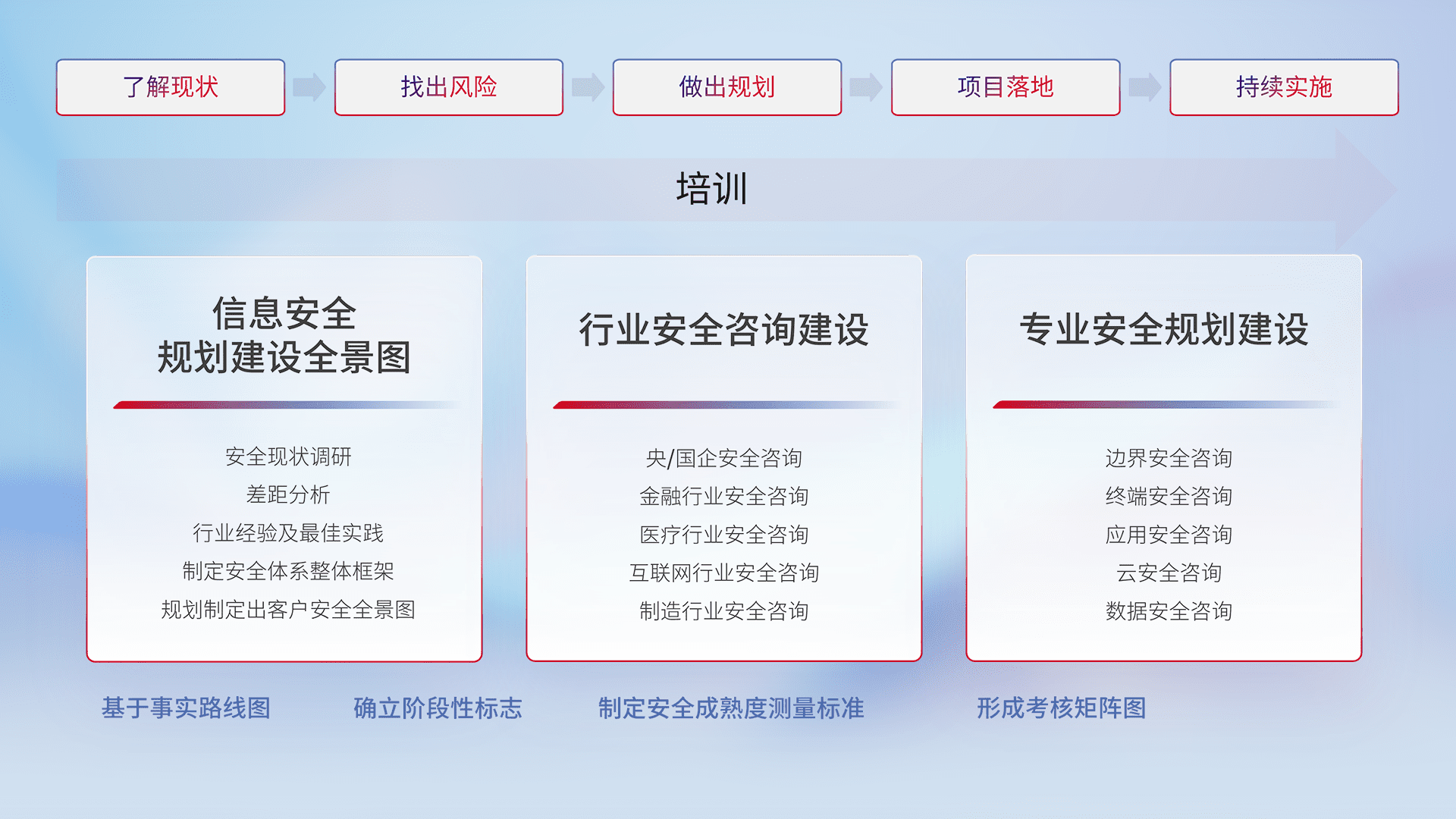 针对客户行业特性,,,以专业的安全服务+多厂商联合解决方案提供专属的一站式安全管理服务,,帮助客户全面感知网络空间威胁,,基于识别、、检测、、分析、、防护、、、监测、、、、响应的服务理论模型,,,,从方案咨询、、、集成交付、、评估验证、、、、优化加固、、、、运维运营,,致力于为客户提供完整的闭环管理式安全服务。。。以实战经验为客户打造高抵御风险的安全体系,,帮助客户发现威胁、、、、对抗威胁、、、、处置威胁,,不断积累安全对抗能力,,,,持续保障数字化安全。。