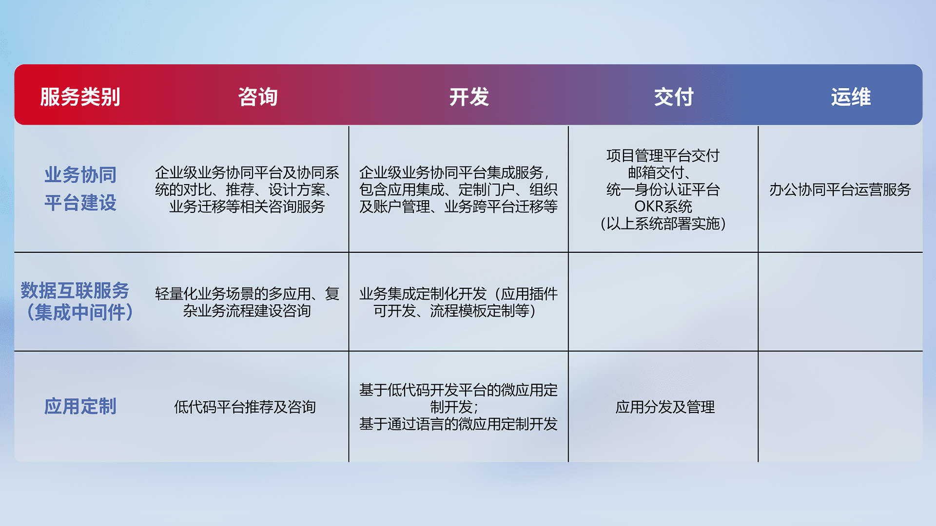 针对钉钉、、企微、、、、IDaas等平台级产品提供产品的规划、、、、方案、、交付、、定制化开发等服务,,,,实现如统一协同办公、、智能客户服务、、、、混合会议管理、、智能数据查询、、等业务场景,,,,实现数字化转型。。